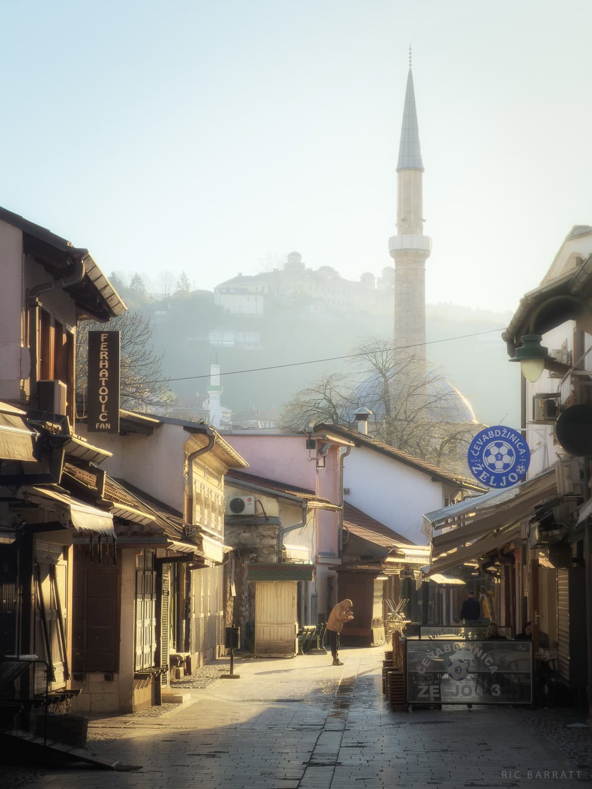 Ćurčiluk Veliki is a historic street in Sarajevo’s old town, known for its traditional buildings and small shops that reflect the city’s Ottoman-era layout. It’s a quieter area compared to the main bazaar streets, offering a more relaxed view of everyday life in Baščaršija. In the background, the dome and minaret of the Baščaršija Mosque are visible, while further in the distance the Jajce Barracks can be seen.