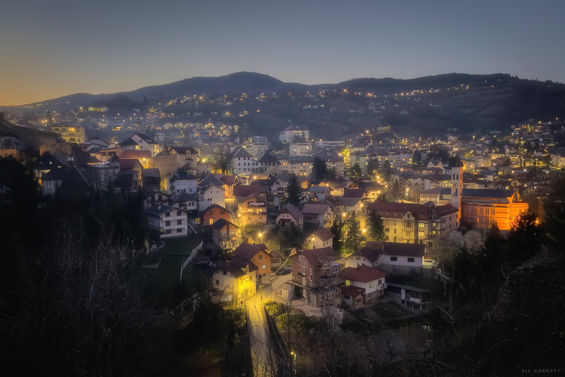 Just north of the historic core of Jajce, the town opens into a more modern, lived-in district along the banks of the Vrbas River. By twilight, this quieter area takes on a different character: streetlights flicker on, windows glow softly, and the outlines of residential buildings and small businesses settle into the fading light. The river becomes a dark, steady presence, while the steep hillside of the old town rises behind in shadow. Without the bustle of the historic centre, this northern stretch feels calm and atmospheric at night.